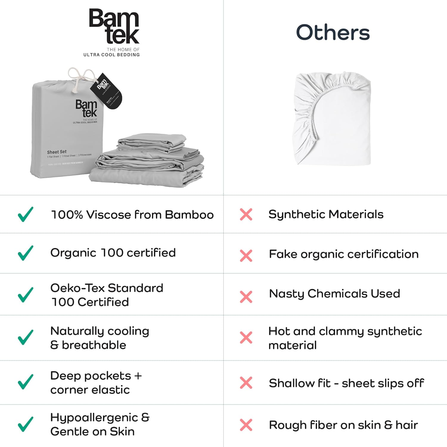- Because You Deserve Better: Say goodbye to harsh chemicals, Bamtek 100% Viscose Bamboo Sheets are organically certified & Oeko Tex standard 100 certified - skin friendly, a hypoallergenic bedding and those who value pure natural comfort.