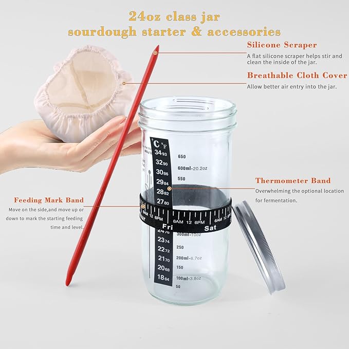 - Complete sourdough bread making kit:This comprehensive bread making kit has everything you need to create artisanal sourdough bread at home. It includes a 9-inch round and a 10-inch oval bread fermentation basket, a sourdough starter kit, a Danish dough whisk, a wooden bread lame with 5 replaceable blades, high-quality plastic and stainless steel dough scrapers, a kitchen scale for precise measurements, a 24-ounce glass jar with a wide mouth, a long and narrow silicone spatula, a breathable cotton cover, a thermometer, and a feeding belt for easy fermentation tracking. With these essential tools, you can easily master the art of sourdough bread making and create delicious loaves with ease.