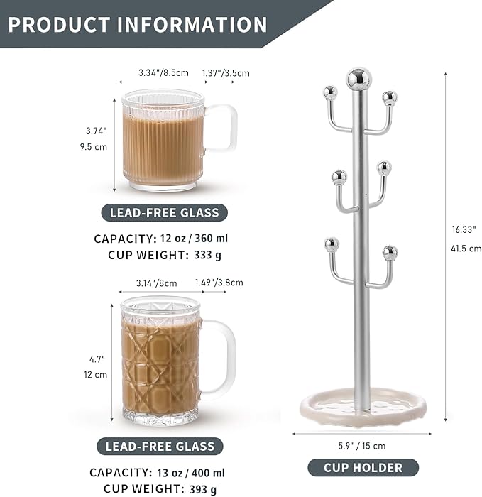 - Versatile Design:This set includes 6 12 ounce glass mugs and a cup holder, which can be used for hot and cold drinks, tea cups, coffee, American latte, cappuccino, and is very suitable for daily casual dining and entertainment gatherings
