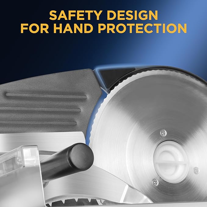 - BUILT-IN SAFETY FEATURES: The deli slicer is designed with safety in mind, featuring a sliding feed table and food holder that keep your hands protected during use.