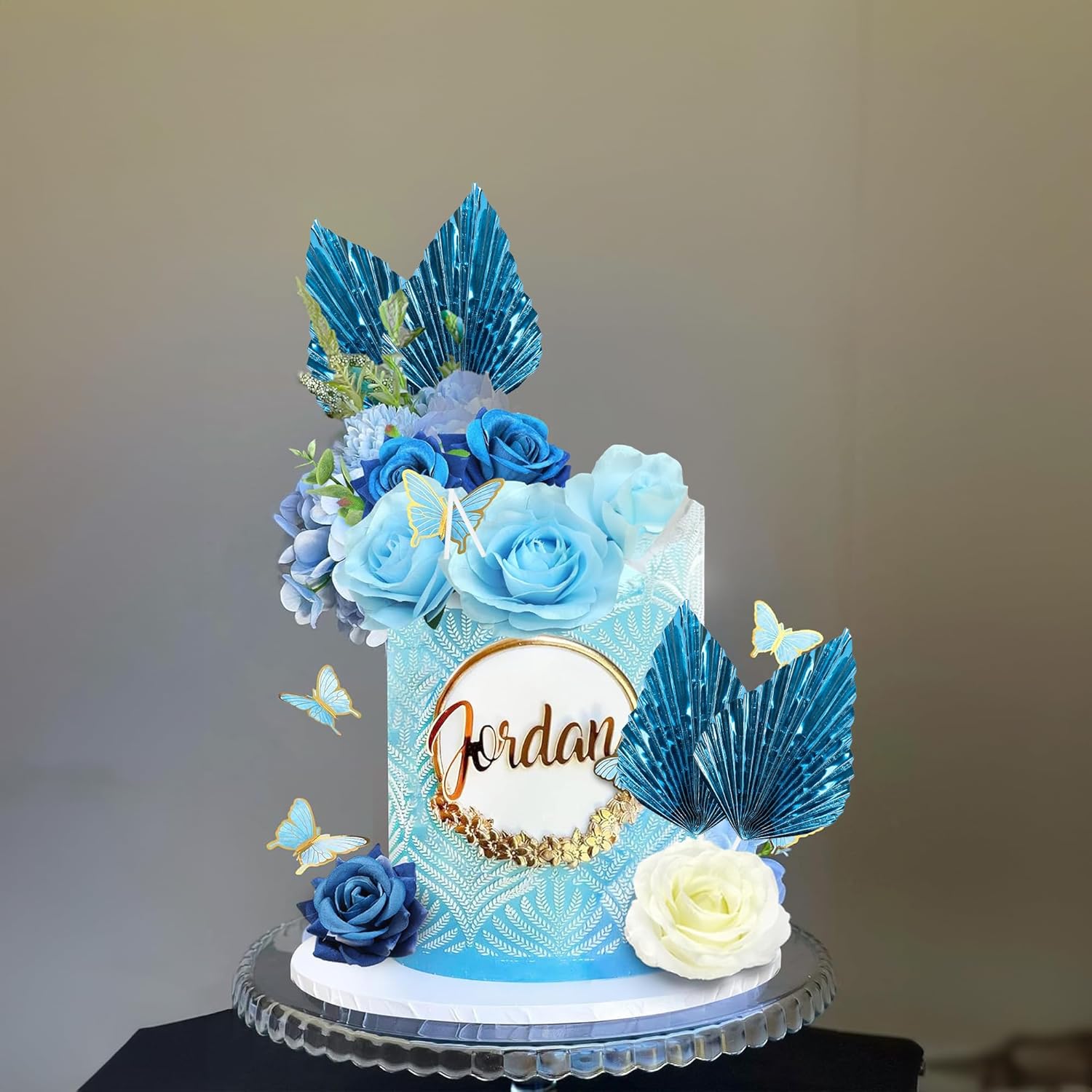 Gyufise 6Pcs Paper Palm Fan Cake Toppers Palm Spear Leaves Fan Cupcake Toppers Cake Insert Decorations Craft DIY Cake Bakeware Decoration for Birthday Party Wedding Party Decor Supplies Light Blue