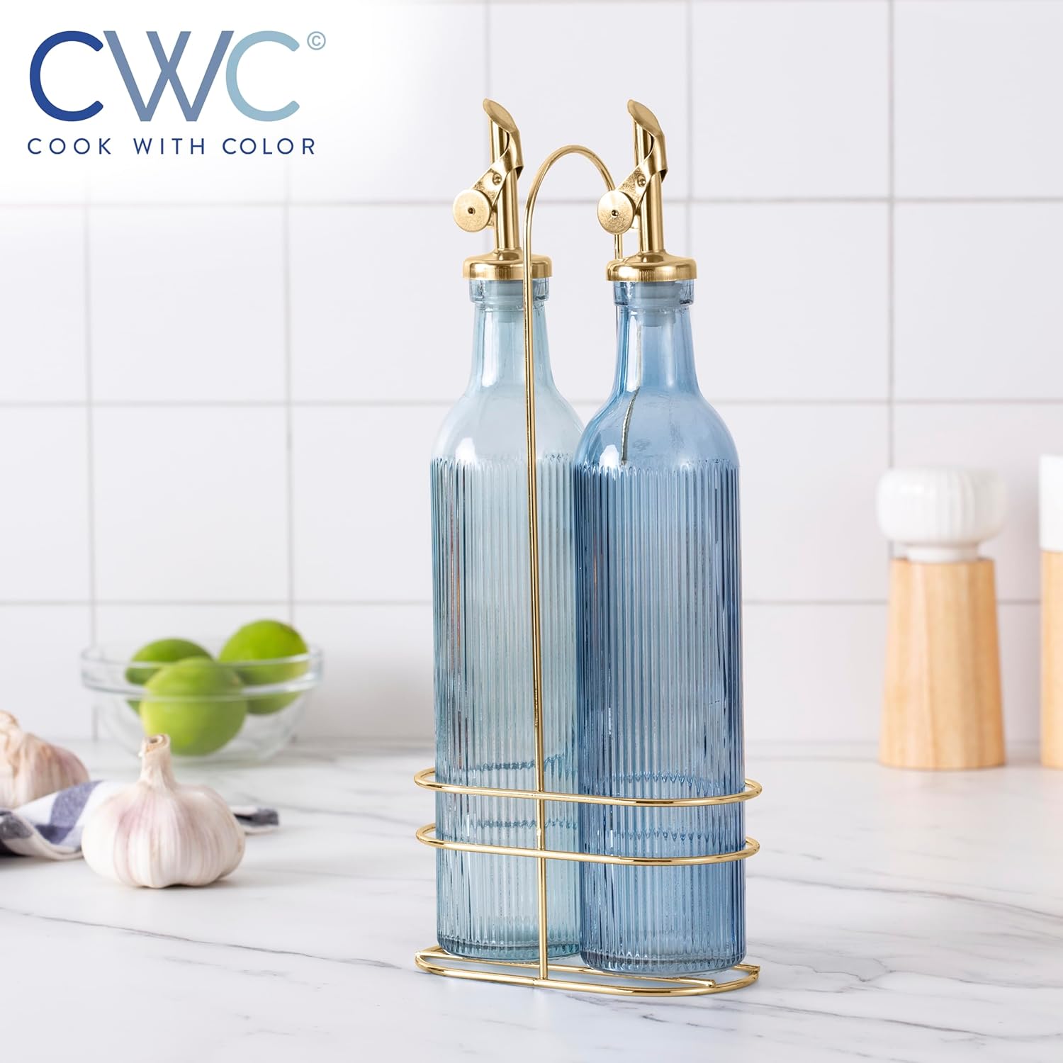 - Beautiful and Functional - Our colored glass oil dispensing bottles, with elegeant colors, gold tops and gold wire rack, will elevate your kitchen. Don't use just any oil bottle, upgrade the way you cook. That's our mission.