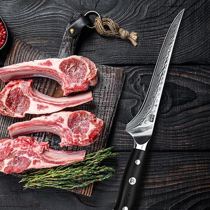 - Japanese Steel Knife Core, Super Sharp: SHAN ZU fillet knife core is made of 10Cr15Mov Damascus Japanese steel that has high hardness(62 HRC), rust-proof, and wear-resistant features; with advanced forging technique, you will get a super sharp kitchen knife