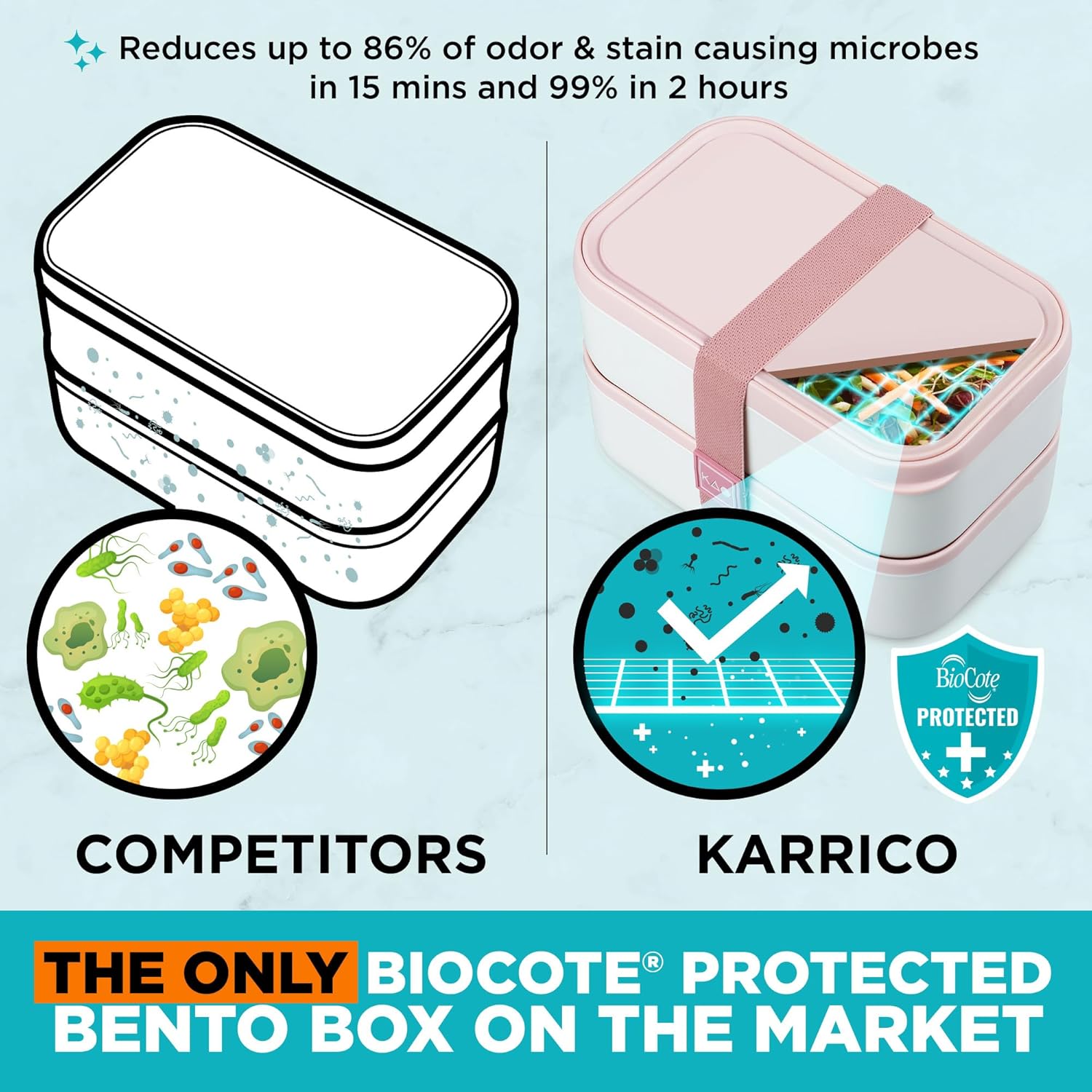 - BIOCOTE PRODUCT PROTECTION - Food leaving a lingering smell in your lunchbox is always a worry. The BPA free, leakproof and food contact safe surfaces of KARRICO bento boxes have BioCote technology that helps protect against stains and bad odors. *BioCote technology does not protect users or others against disease-causing germs, and other harmful organisms. This technology is not a substitute for good hygiene and/or cleaning practices.