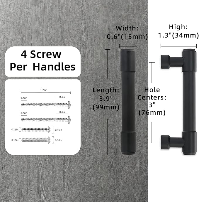 - SIZE: Hole Center: 3 inches (76MM); Overall Length: 3.9 inches (99MM); Width: 0.6 inches (15MM); High: 1.3 inches (34MM); Please double check the size of the pull you need before purchasing.Each pull handle includes two 1.1-inch and two 1.73-inch screws.
