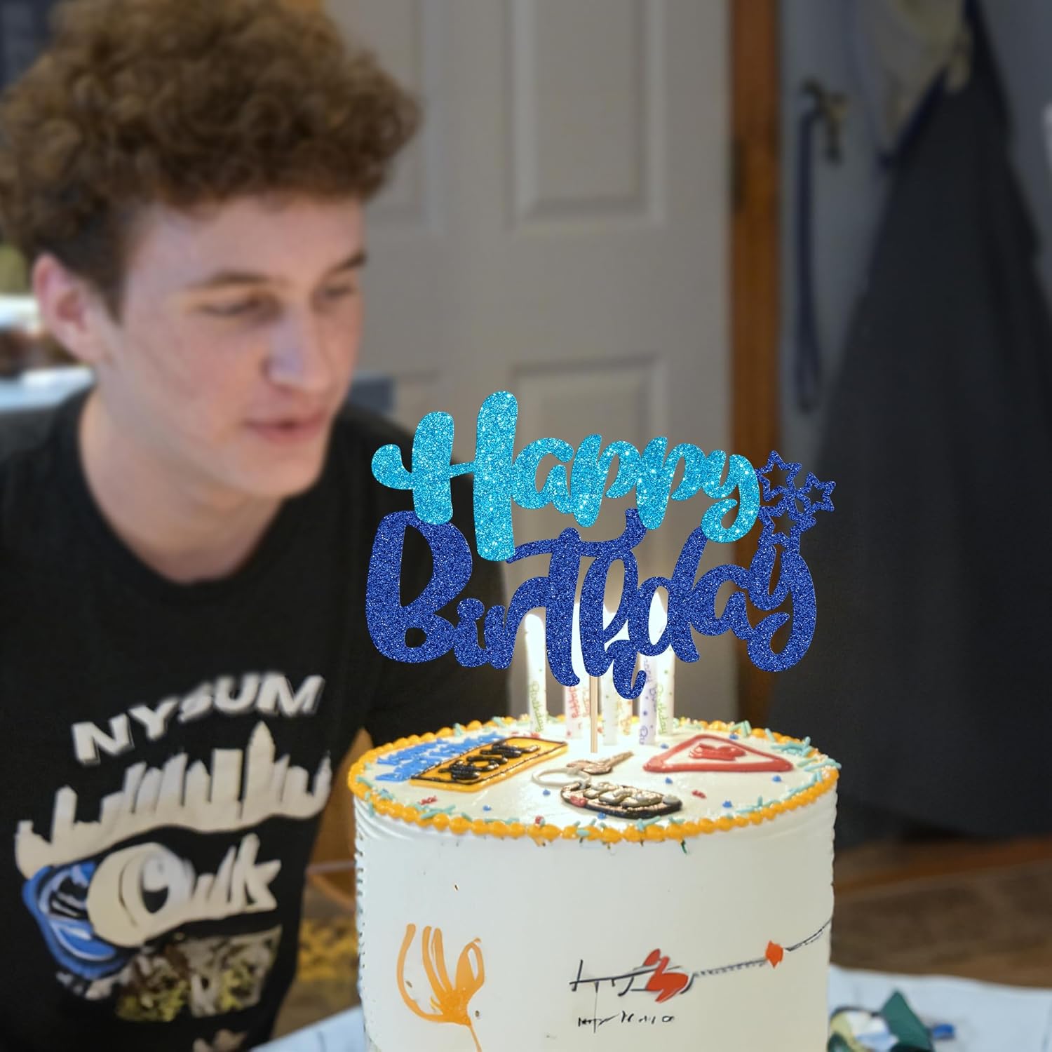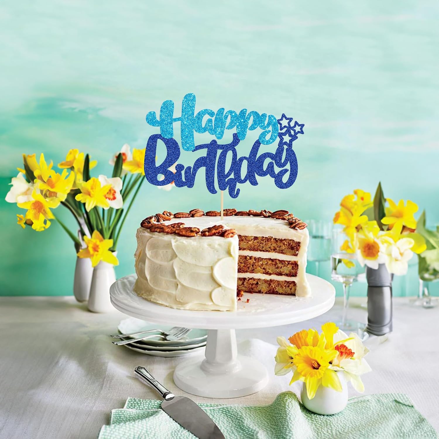 Ephlyn 1Pcs Happy Birthday Cake Topper Glitter Cake Pick for Celebrating Anniversary Theme Party Cake Decorations Supplies Blue