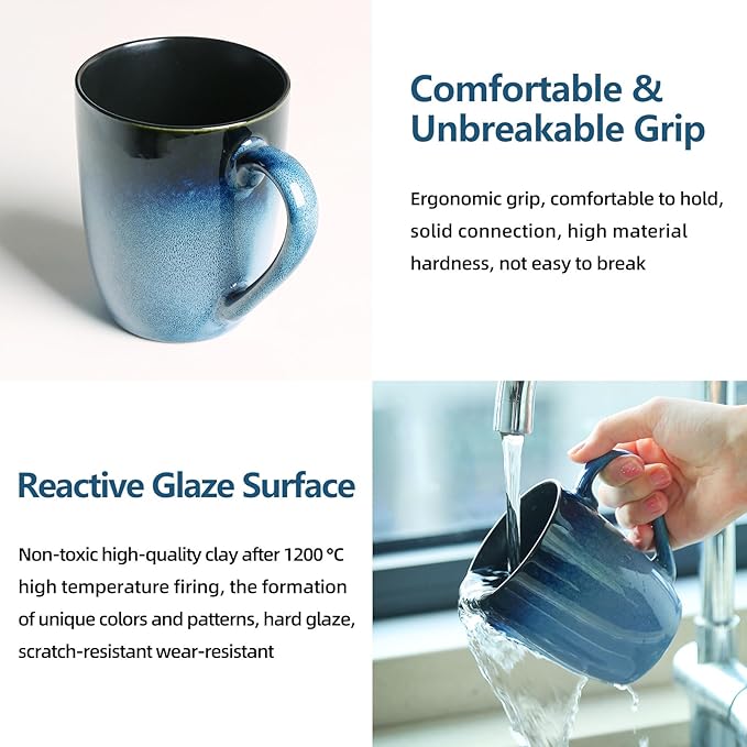 - 【UNIQUE GLAZE】: Active glazes can create stunning color arrays.Star Blue reaction glaze combined with Black gradient brings you into a starry experience..They are both interesting and creative. Every ceramic coffee cup is unique.