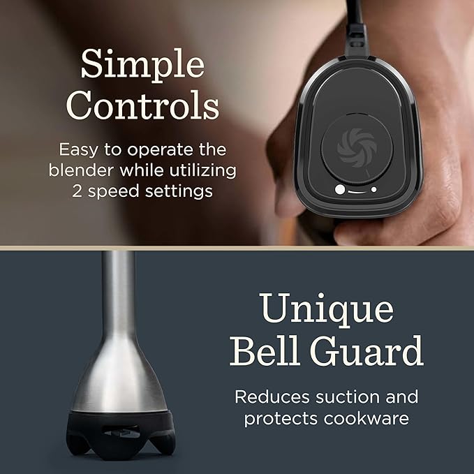 - Protects Cookware: A unique bell guard on the end of this handheld blender reduces suction and helps ingredients flow easily through the two-pronged blade while protecting pots, pans, and your favorite cookware from scratches