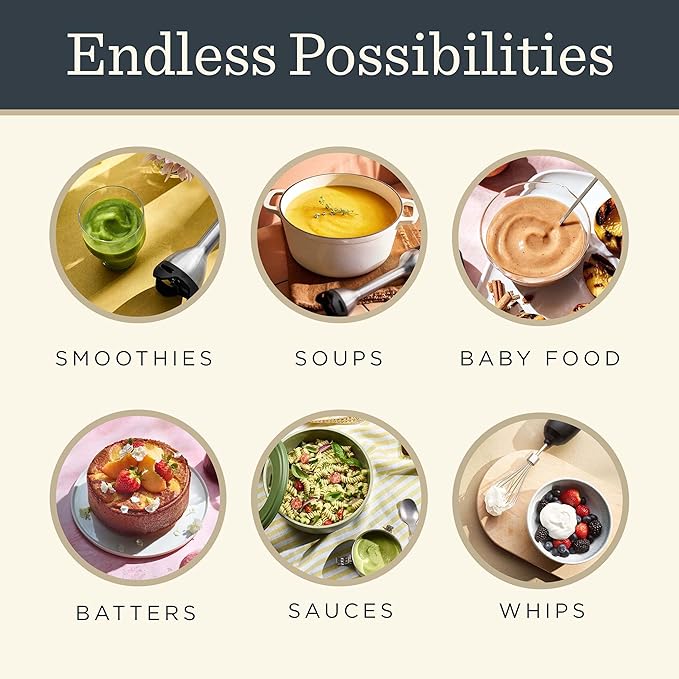 - Versatile Tool: Blend hot soups directly in your cooking pot, then switch to the electric Whisk Attachment to whip cream for dessert, all without switching between multiple kitchen tools; blends in containers with 3-inch wide openings or larger