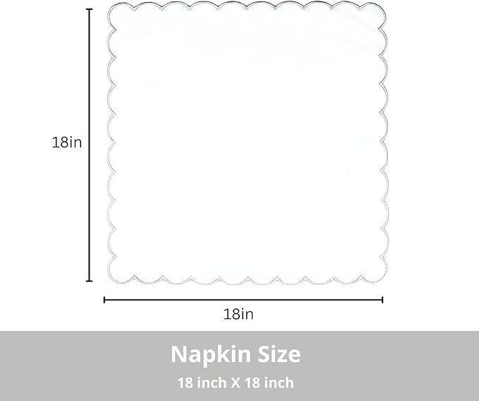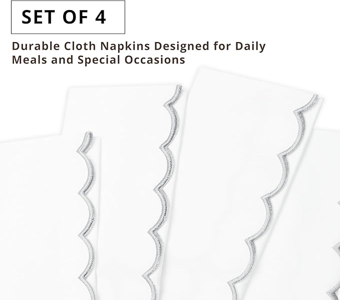 PurpleEssences Scalloped Embroidery Cloth Napkins Christmas Holiday Winter Table Decor 100% Cotton Set of 4-18 x 18 inch - White - Edges - Silver