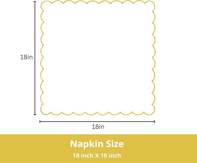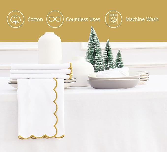 PurpleEssences Scalloped Embroidery Cloth Napkins Christmas Holiday Winter Table Decor 100% Cotton Set of 4-18 x 18 inch - White - Edges - Gold