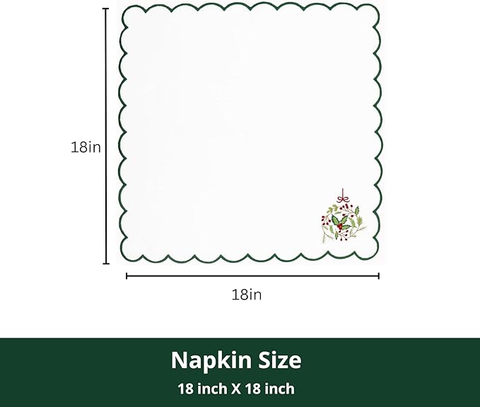 PurpleEssences Scalloped Embroidery Cloth Napkins Christmas Holiday Winter Table Decor 100% Cotton Set of 4-18 x 18 inch - White - Edges - Forest Green - Christmas Wreath