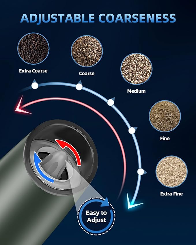 XinXu Gravity Electric Pepper Grinder, Salt or Pepper Mill & Adjustable Coarseness, with LED Light, One Hand Automatic Operation -Set/DarkGreen