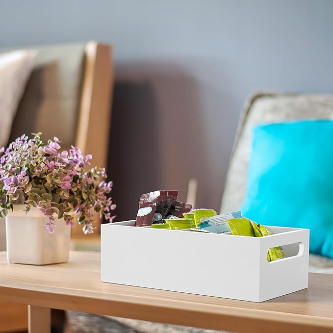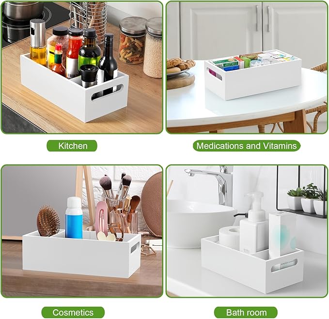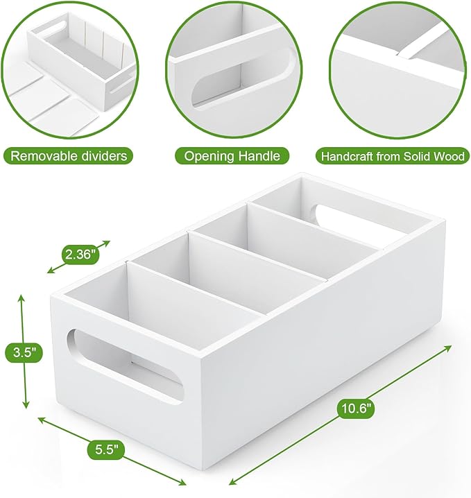 - Customizable compartments: The wooden pantry storage bin has 3 removable dividers, making it easy to adjust the size of the slots for your needs. The dividers are easy to insert and remove. They would work well in the kitchen, cupboards, pantries, kids' snacks, and drawers. You could even use them to organize a medicine cabinet or bathroom cabinet