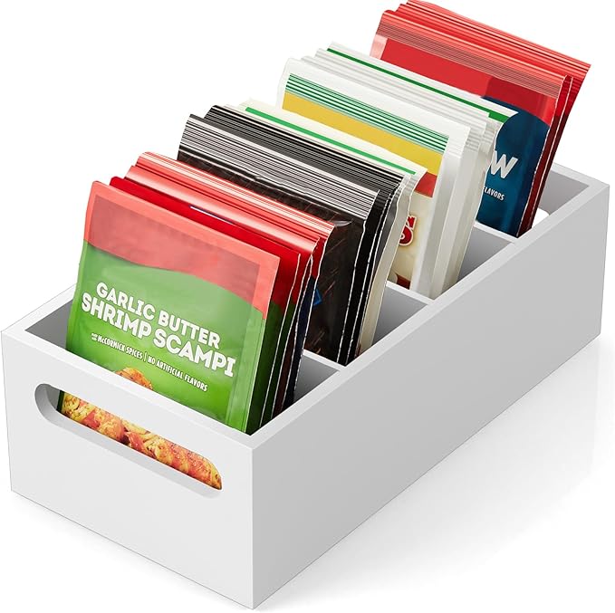 - Versatile Pantry Organizer: This compact kitchen packet organizer with 4 slots is great for storing packets of dressings, seasonings, sauces, spices, soup, gravy, tacos, snack/protein bars, or other small packets; it has endless uses all over the house to keep things organized
