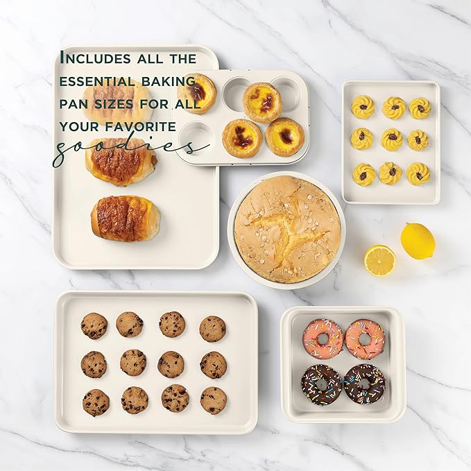 - Complete 13-Piece Set – This all-in-one bakeware collection includes cookie sheets, cake pans, a cooling rack, and durable oven mitts, providing everything you need for baking and cooking like a pro.