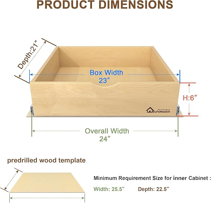 - 【Confirm the Size】Measure your cabinet before you choose your drawer! This Pull Out Cabinet Organizer measures 23” W x 21” D x 6” H.For ease of installation, we require a minimum internal cabinet size: Width: 25.5” , Depth: 22.5”, which is the size of the pre-drilled template. If there are hinges, ensure the width between obstructions > the drawer width