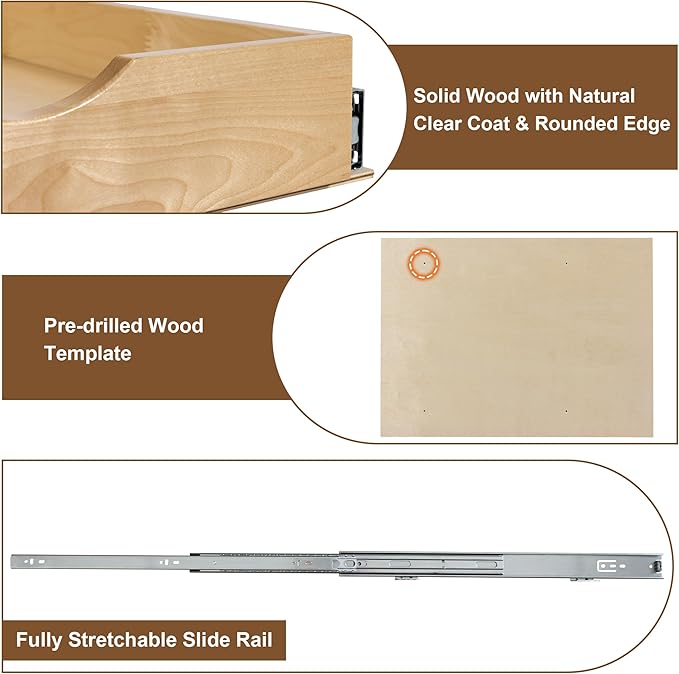 - 【Smooth Sliding】Use heavy-duty full-extension steel slides with ball-bearing rail system, this pull out drawers for cabinets slides in and out smoothly. Just one easy pull and the whole drawer is within reach.