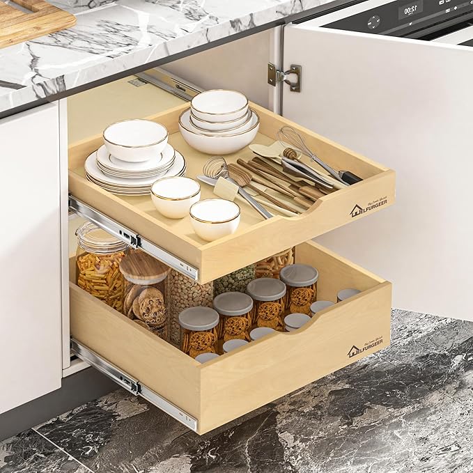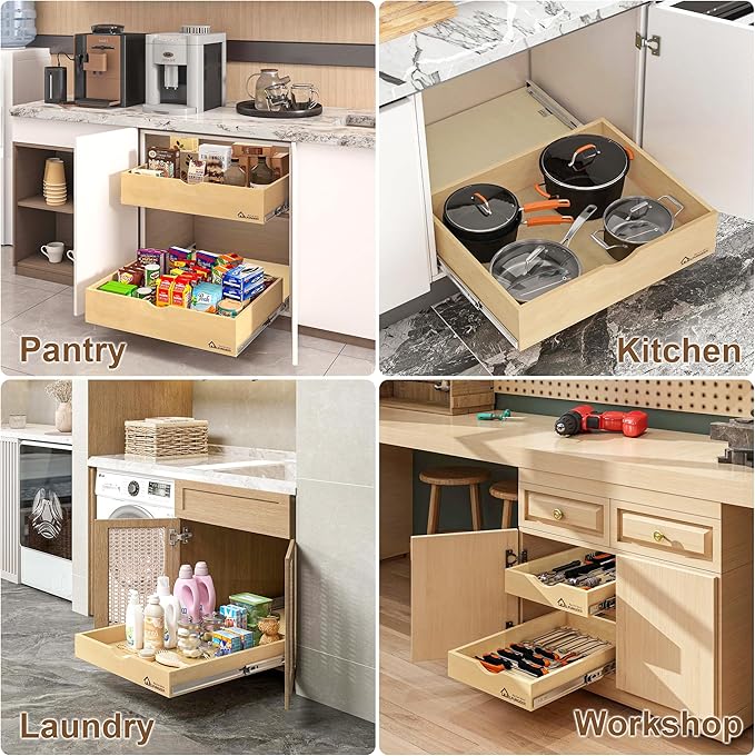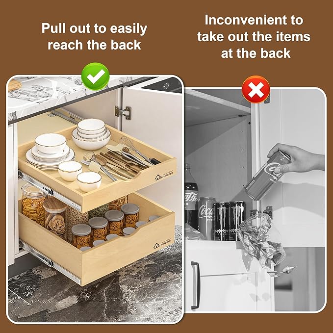 - 【Pull Out Cabinet Organizer】Tired of straining your arm to reach the back of your cupboard? This full extension slide out drawers for kitchen cabinets with smooth slides will help you organize your cabinet. With just one easy pull, you can effortlessly access the items in the deep cabinet