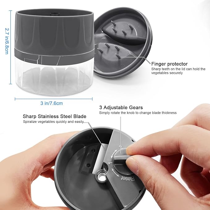 - HIGH QUALITY MATERIALS-The blade of spiralizer is made of high quality stainless steel. Due to its compact size, it takes up minimal space and fits comfortably in the hand for precise and safe cutting.