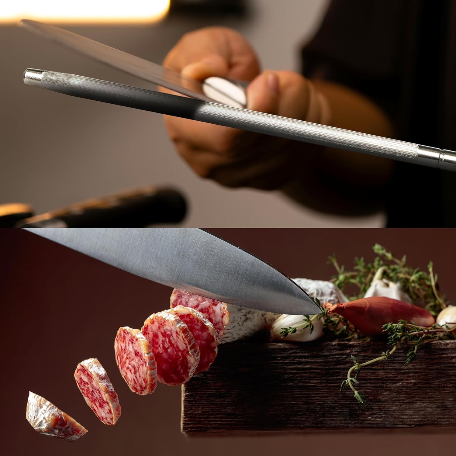 - Premium Construction: Constructed from durable carbon steel and coated with nickel-chrome, our sharpening rod combines longevity with functionality. The finely ground surface of the rod ensures that your knives are sharpened without damaging the cutting edges, preserving the life of your blades.