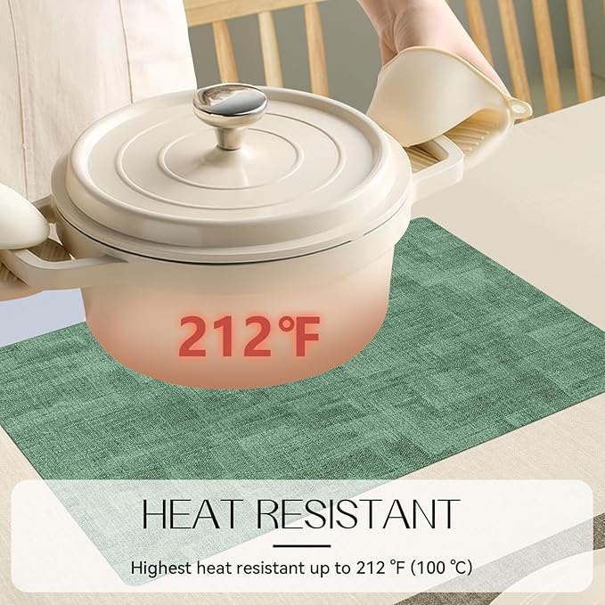 - HEAT-RESISTANT: Both sides are made of long-lasting and heat -resistant faux leather. the thickened placemats (0.12 inch/ 0.3 cm) ensure the heat won’t transfer to your cherish table. Highest heat-resistant can amount to 212 °F (100 °C), from leaving a white heat mark.