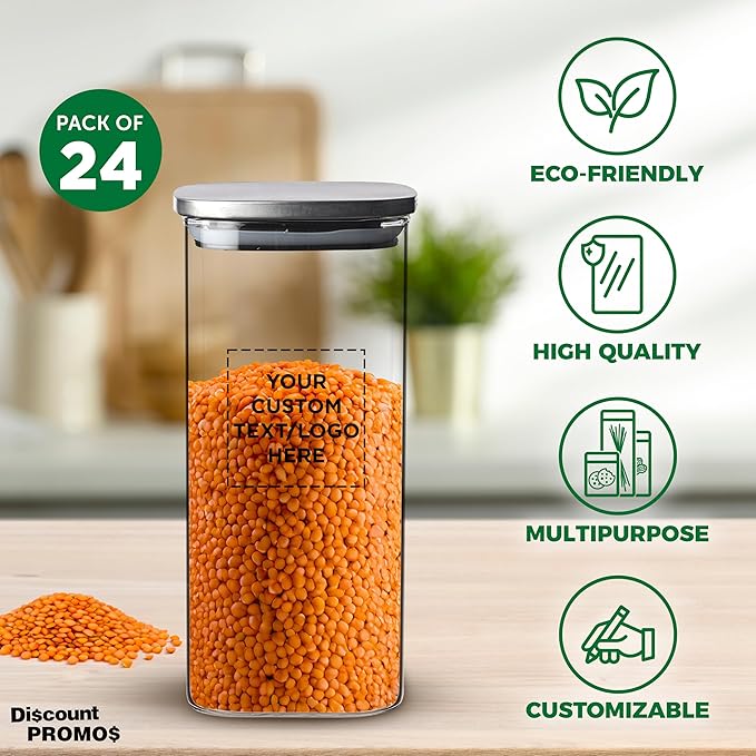 DISCOUNT PROMOS Custom Branson 53 oz. Square Storage Jars Set of 24, Personalized Bulk Pack - Durable Kitchen Organization, Home Decor Essentials, Food Storage Solutions - Clear