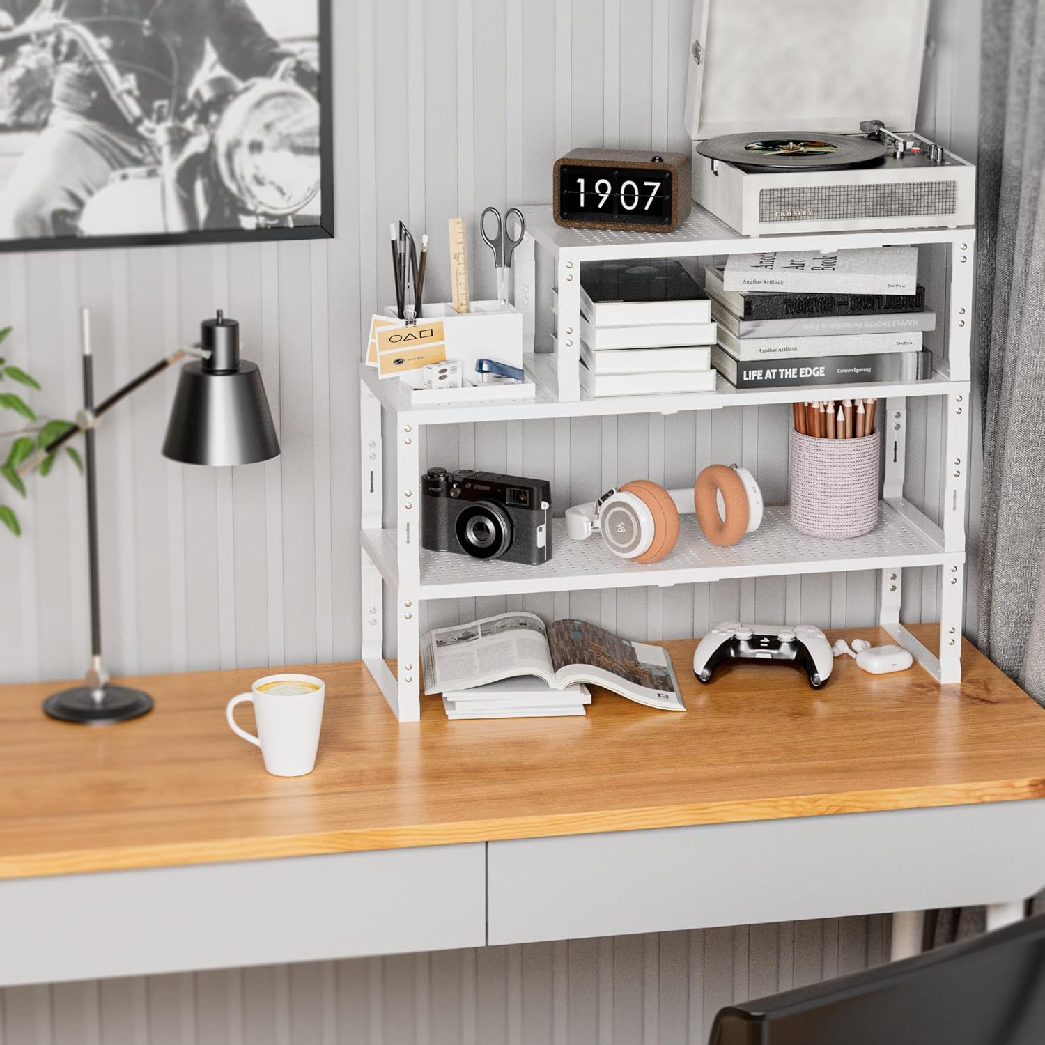 - âăExpandable,StackableăThe shelves can easily expand and contract according to your storage needs, whether it is kitchen clutter or office supplies.You can combine multiple shelves together to form a large storage system, or separate them into several separate smaller units(Measureďź10.24"D x 16.54"W~27.17"W x 8.31"H/7.68"H/7.05"H/6.42"H)