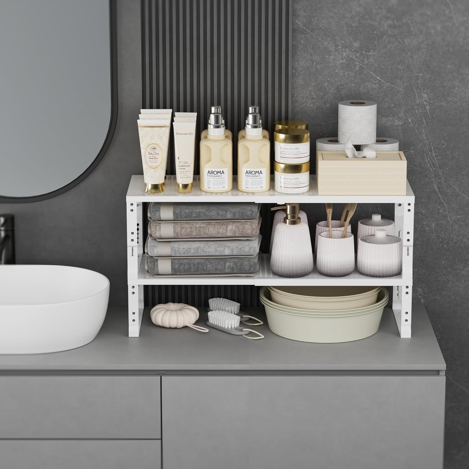 - âăExpandable,StackableăThe shelves can easily expand and contract according to your storage needs, whether it is kitchen clutter or office supplies.You can combine multiple shelves together to form a large storage system, or separate them into several separate smaller units(Measureďź8.11"D x 16.54"W~27.17"W x 8.31"H/7.68"H/7.05"H/6.42"H)