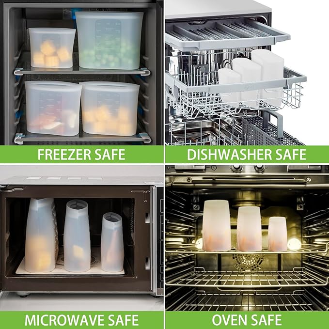 - 【DISHWASHER FREEZER MICROWAVE OVEN SAFE】Tired of dealing with plastic bags?(PEVA is actually a type of plastic.) Switch to silicone bags reusable storage and spend less time worrying about saving leftovers safely. These reusable bags are non-toxic and safe for use in the Microwave, Freezer, Oven and Dishwasher. They can even withstand temperatures up to 428℉, making them ideal for all your food storage needs