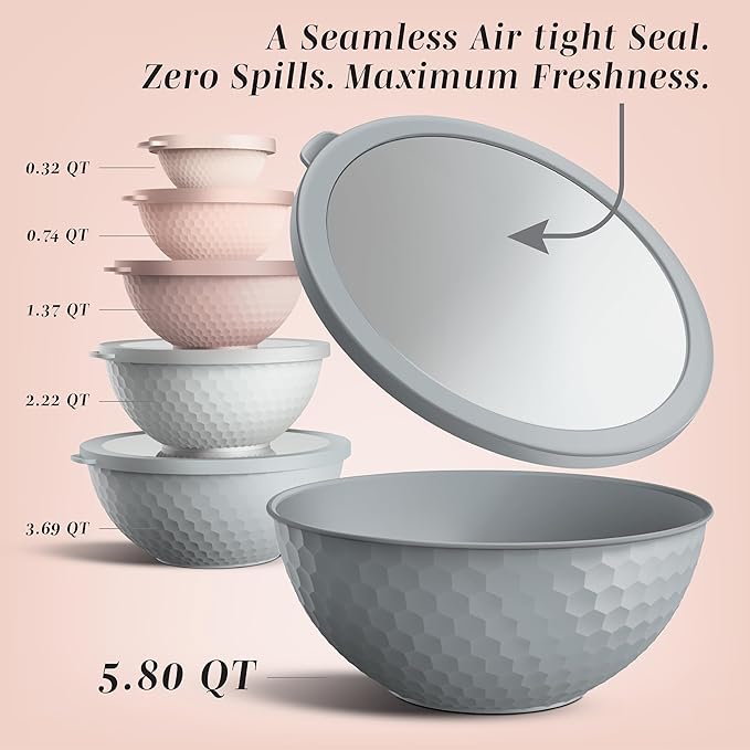 - Set includes 6 plastic bowls and 6 TPR lids; Bowl capacity of 0.32 QT, 0.74 QT, 1.37 QT, 3.69 QT and 5.8 QT.