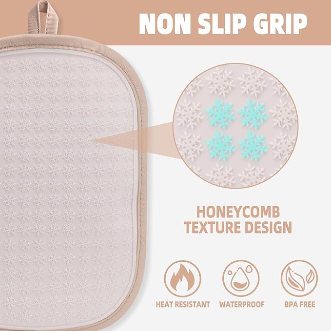 - 【HIGH HEAT RESISTANCE】Experience ultimate protection with our pot holders featuring a surface made from high-quality food-grade silicone. The organic cotton quilted liner of this hot pads for kitchen enhances heat resistance, ensuring your hands are shielded from high temperatures during cooking.They will help shield your hands from heat up to 500F Fahrenheit.