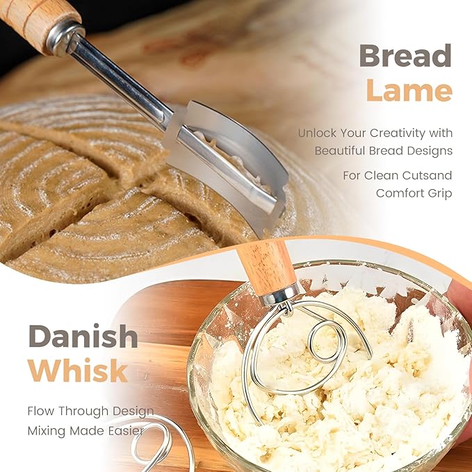 - 🥖【Perfect Sourdough, Perfect Pattern】A Professional Danish Dough Whisk can help us to mix flour more easily and fully. Use the Dough Scraper to customize the shape and size of the dough you need. Bread lame can help you design a variety of beautiful bread patterns (there are 5 Replaceable Blades).