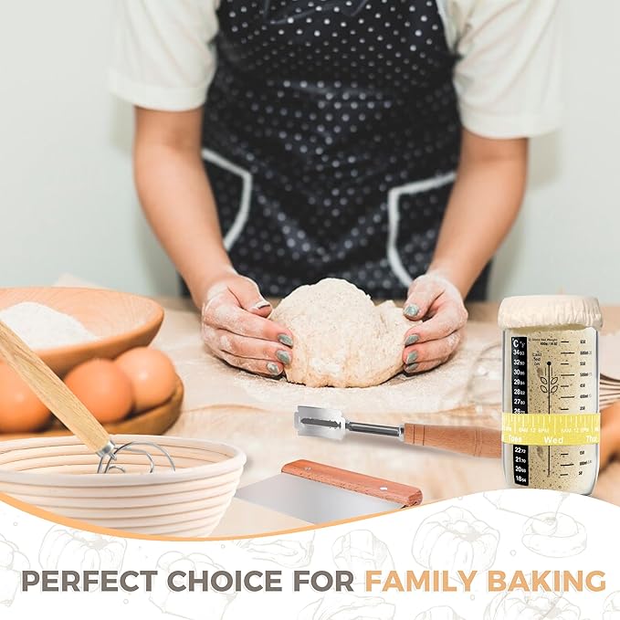 - 🥖【The Ultimate Sourdough Starter Kit】DOYOLLA All-Inclusive Sourdough Starter Kit has everything you need to refine your bread baking process. It includes 24oz Glass Sourdough Starter Glass Jar, 2 8.5" Rattan Proofing Basket (Round), 10"Silicone Spatula, Dough Whisk, Metal Dough Scraper, Bread Sling, Feeding Time & Level Tracker, Thermometer Band, Bread Lame with 5 Replaceable Blades, Silicone Brush, Breathable Cloth Cover. The ultimate kit make the starter process and baking easier.Perfect Home Proofing Baskets Kit for Sourdough Bread Baking