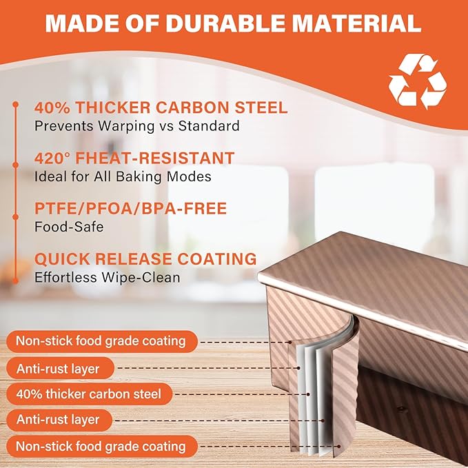 - 【Unique design】1. With a food-grade non-stick coating, you can easily pop out bread from the toast pan. 2. The bottom vent design enables even heating of the dough, preserves the taste and quality of food. 3. The lid can be smoothly opened and closed by the sliding lid design in the oven. 4. You can directly grip and lift the baking pan with the round rolled edge design.