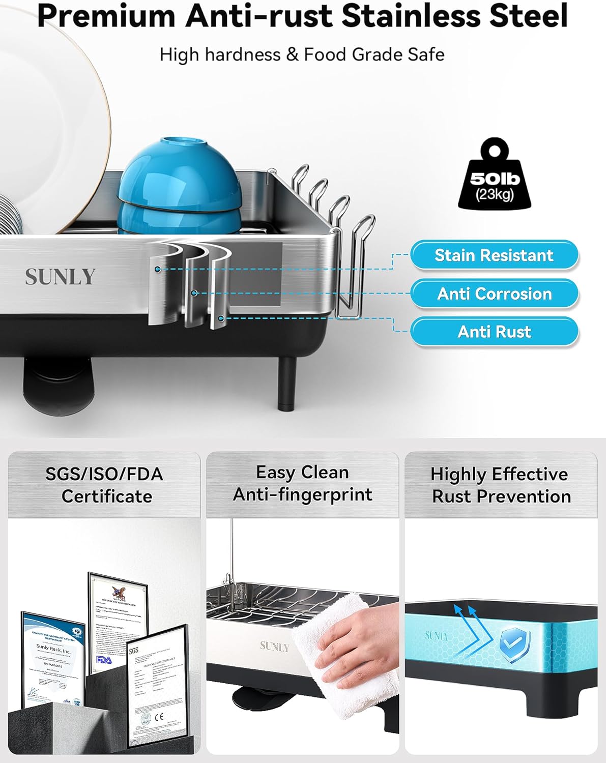 • [Premium Anti-Rust 304 Stainless Steel]: The dish rack is crafted from high-quality brushed stainless steel and passes a 72-hour salt spray test to ensure rust-proof durability. Its sleek, fingerprint-resistant finish makes it easy to clean, providing a sturdy, low-maintenance solution