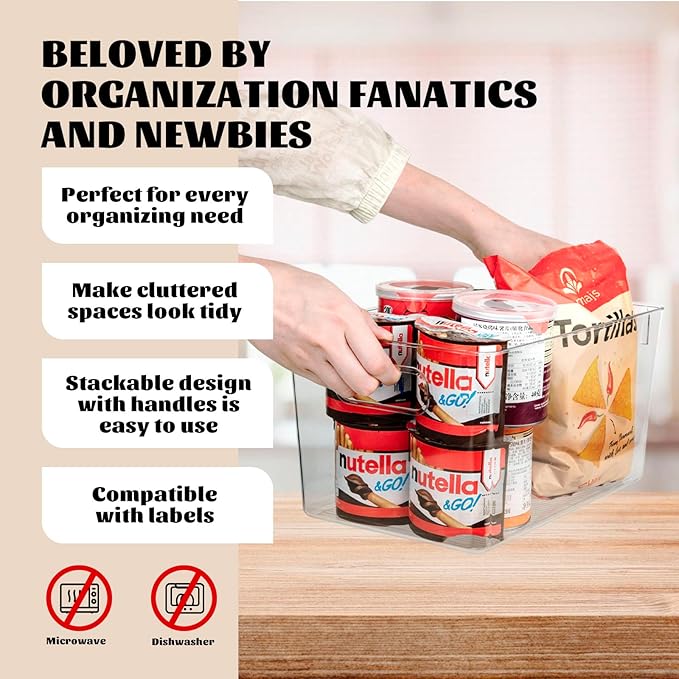 - 【STACKABLE, CLEAR, AND EASY TO HANDLE】 Featuring a transparent body for quick content identification, these bins keep your items visible and organized. Built-in handles allow for easy access and portability. Their stackable design maximizes vertical space, making them ideal for efficient kitchen organization and home tidiness.