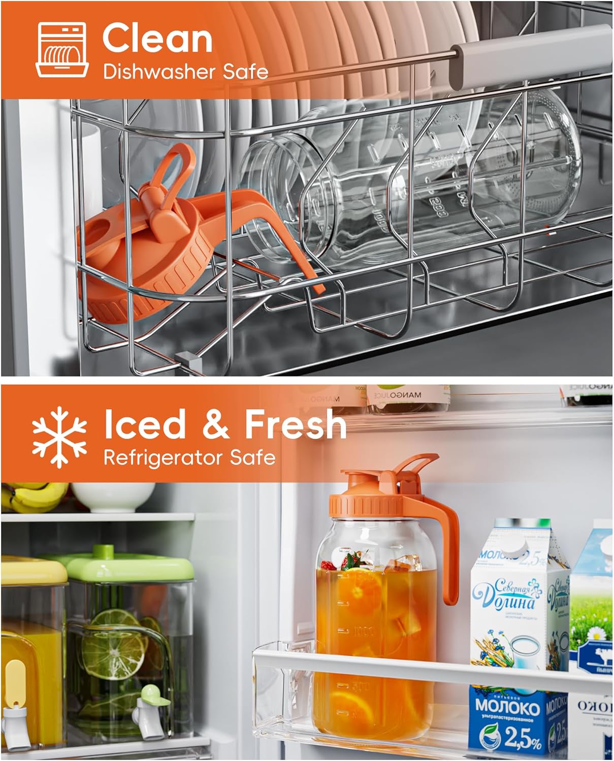 - Keep Your Drinks Fresh and Flavorful: The 64oz glass pitcher features an airtight flip lid with a silicone seal, ensuring your favorite beverages stay fresh and flavorful while being leak-proof. It’s designed for easy and convenient opening, pouring, and closing, making it perfect for storing your drinks