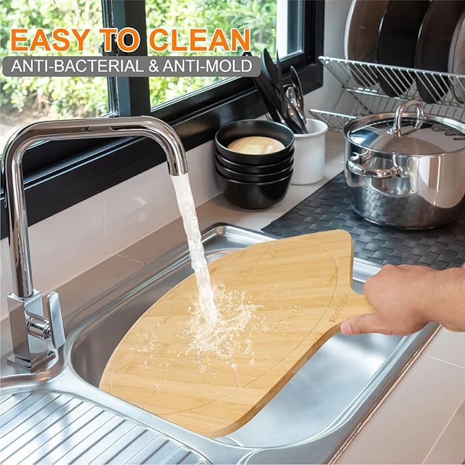 - 【Easy Wash and Wall Handing】Eextended handle of the pizza board, the edges are carefully polished, make the holding feel more comfortable and more emotion. The pizza peel have a wall-hanging hole, easier storing and saving space. Easy cleaning, just need a rinse of water and wipe with a cloth. All keep your kitchen organized and clutter-free.