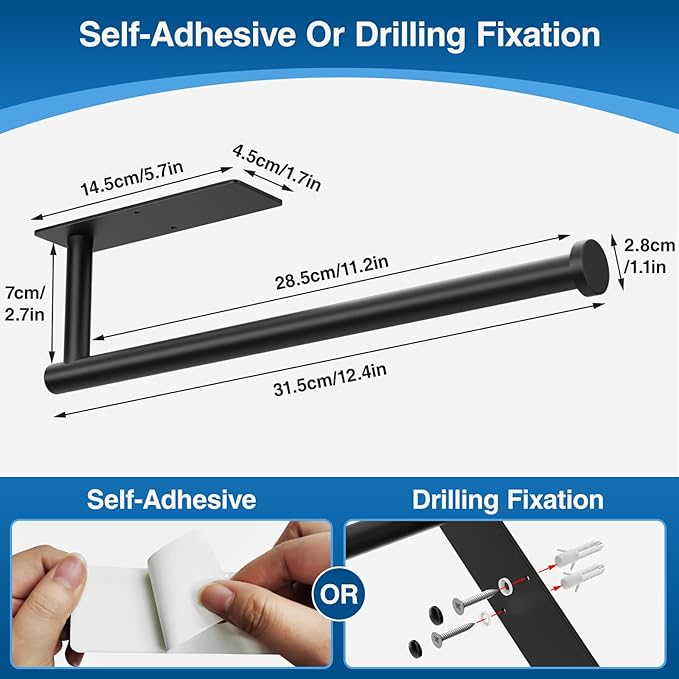 - Easy Installation: There are two ways to install this paper towel holder, self-adhesive or drilled, you can freely choose the appropriate installation method according to your wall or cabinet situation.
