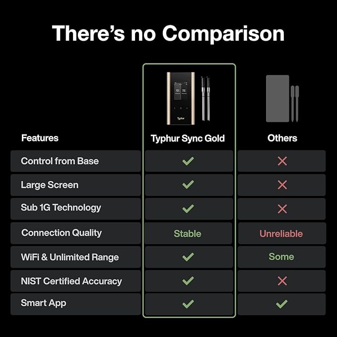 - ใ๐ญ๐ฌ๐ ๐ฆ๐๐ฟ๐ผ๐ป๐ด๐ฒ๐ฟ ๐ฆ๐ถ๐ด๐ป๐ฎ๐น, ๐ฅ๐ผ๐ฐ๐ธ-๐ฆ๐ผ๐น๐ถ๐ฑ ๐๐ผ๐ป๐ป๐ฒ๐ฐ๐๐ถ๐ผ๐ปใThe Sync Gold Series is the worldโs first wireless meat thermometer powered by Sub-1 GHz technologyโoffering a signal strength 10x stronger than traditional Bluetooth thermometers. The connection seamlessly penetrates walls, smokers, kamado grills, and Dutch ovens, ensuring reliable monitoring even in the toughest cooking conditions.