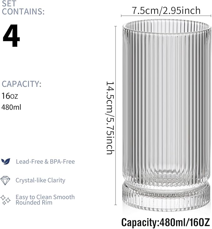 - 【Vintage Charm, Unforgettable Moments】Picture this: a warm summer evening on the patio. The soft glow of string lights overhead, and in your hand, a POLIDREAM 16oz ribbed glass filled with your favorite iced coffee. The vintage glass design takes you back to a simpler time, adding a touch of elegance to your moment. Whether it's a lazy Sunday brunch or a gathering with friends, these glasses are sure to make every occasion special