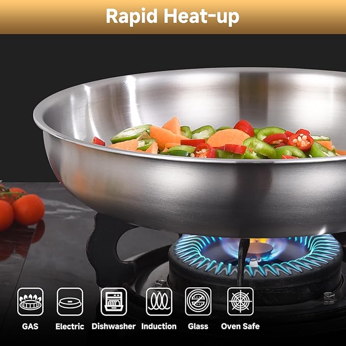 - Triple-Ply Construction for Fast Heating & Energy Efficiency: This stainless steel pan features a premium triple-ply base (stainless steel-aluminum-stainless steel) for rapid, even heat distribution. Retains heat effectively for consistent cooking results while reducing energy consumption, perfect for searing, frying, and simmering