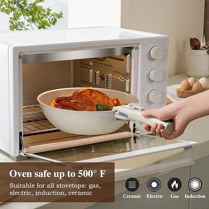 - 【Universal Compatibility & Oven-Safe】The pots and pans set is compatible with all stove types—gas, electric, ceramic, and induction. Designed to withstand high heat, it’s oven-safe up to 550°F, making it perfect for a wide range of cooking methods. The silicone lids are also heat-resistant, up to 350°F