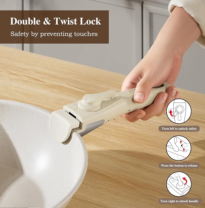 - 【Detachable Handle Cookware for Easy Storage】Our cookware with removable handles offers great convenience, allowing for compact storage. Whether you're at home or on the go, this detachable handle pots and pans set is easy to store in cabinets or RVs. The unique locking system ensures nonstick detachable pans stay securely in place
