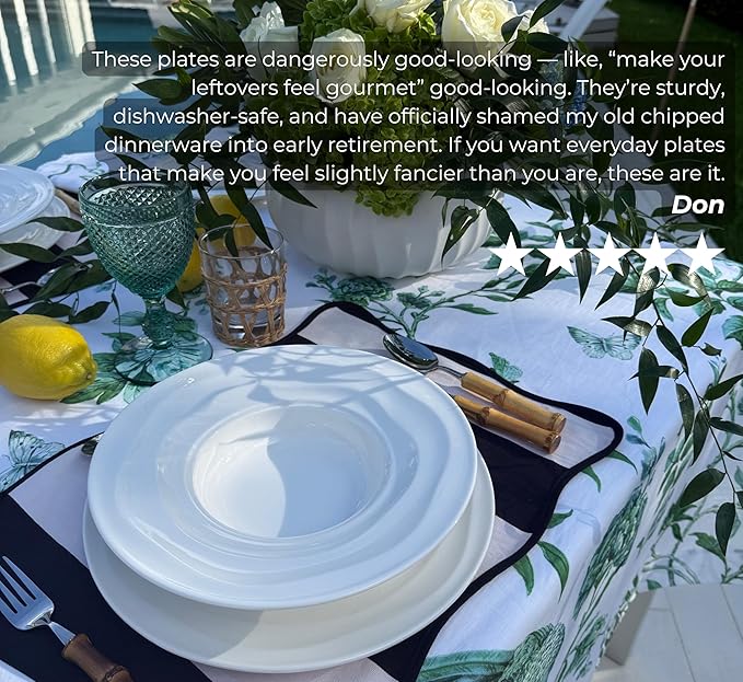 - 1. NEVER BE ASHAMED OF YOUR TABLE AGAIN. Tired of mismatched, cheap-looking plates? This elegant 12-piece white porcelain dinnerware set transforms everyday meals into calm, beautiful moments. Inspired by nature’s quiet textures and coastal charm, it brings soul, style, and effortless sophistication to your table—so you’ll be proud every time you sit down to eat.
