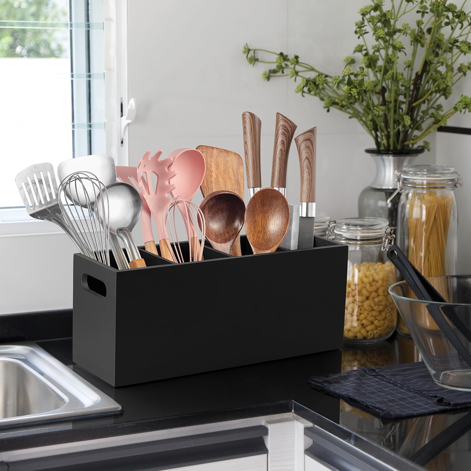 ALELION Large Utensil Holder with Removable Divider - 4 Compartment Wooden Utensil Caddy Organizer for Kitchen Counter - Black Cooking Utensil Crock for Countertop