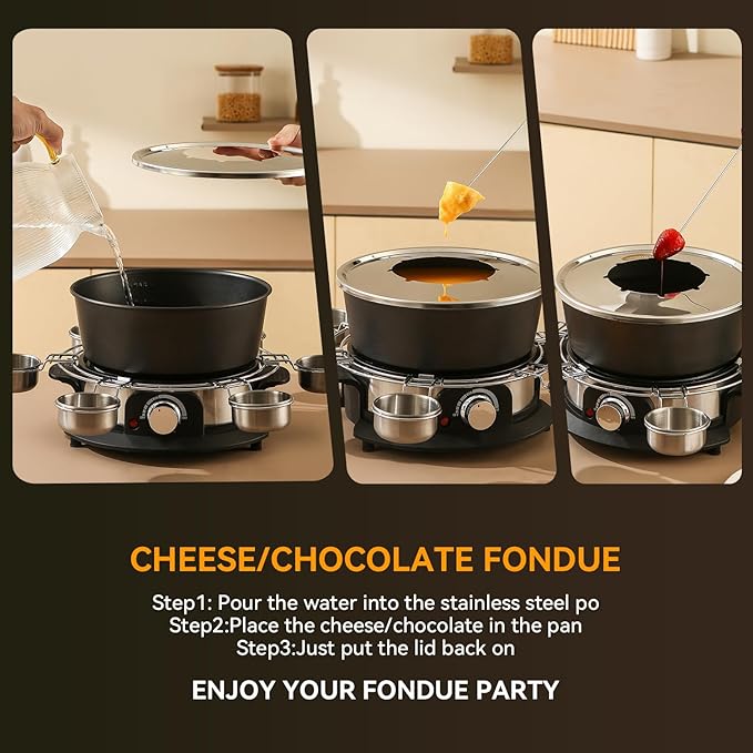 - ALL TYPES OF FONDUE - The temperature of electric fondue maker can be controlled easily with knob, so it can be used for different types of fondue: classic burgundy fondue, cheese fondue, chocolate fondue,oil fondue.Great for dipping fruit,bread,vegetables,meat,marshmallows and more food.