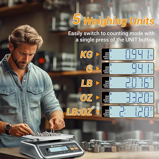 - [Accurate Weighing & Counting] With a 66lb capacity and 0.002lb increment (30kg capacity, 1g increment), this industrial scale, equipped with adjustable feet and leveling bead, ensures utmost accuracy. It excels in counting tasks, effortlessly handling items like screws, bolts, electronic components, pills, and capsules, simplifying inventory management and packaging.