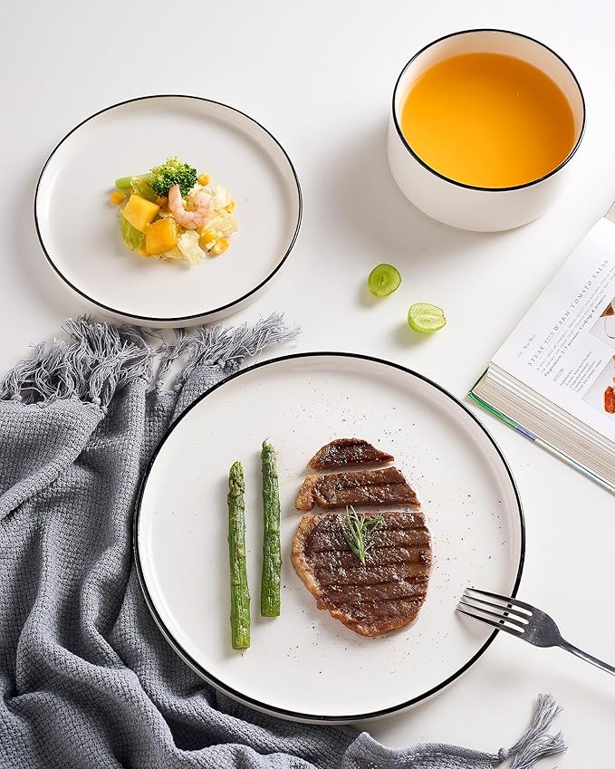 - 【High-Rimmed Edge Design with Black Trim】Featuring high-rimmed edges, these kitchen plates prevent spills, ideal for sauces, condiments or soups. The elegant black stroke along the edges contrasts with the pure white body, merging modern style and art—making the set a real standout at any table.
